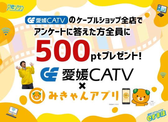 愛媛CATVケーブルショップにて専用のアンケート用紙にお答えいただいた方を対象に、500ポイントを付与いたします。※2026年1月23日受付分まで。