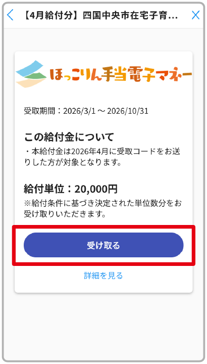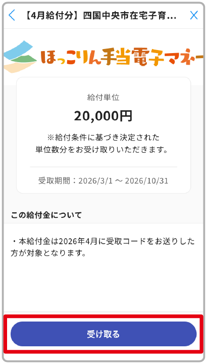 給付金名・給付額・給付内容詳細を確認し、間違いがなければ「受け取る」ボタンをタップ