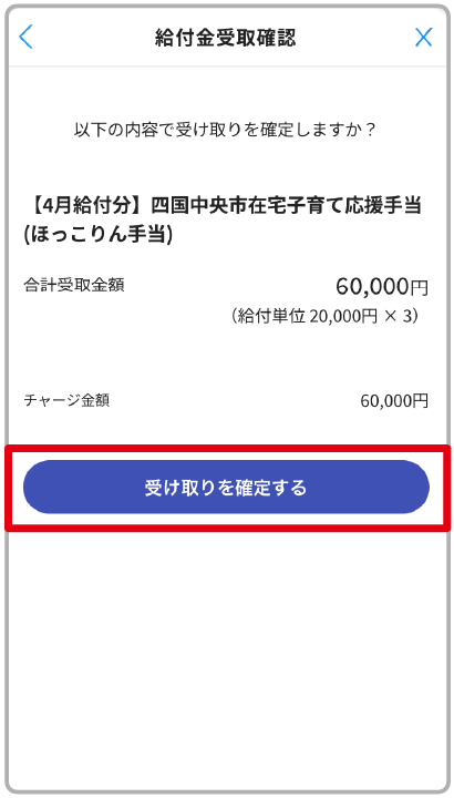給付名と給付額を最終確認し、間違いなければ「受け取る」をタップ