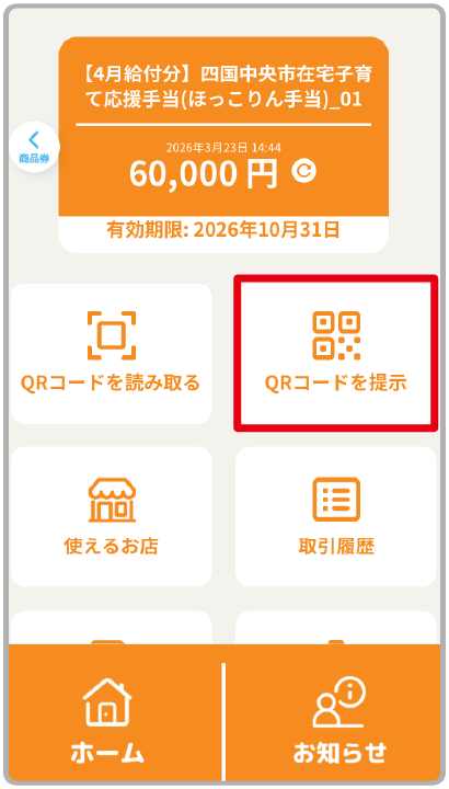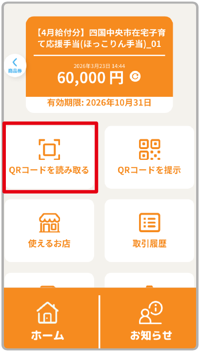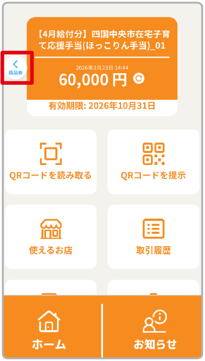 みきゃんアプリのトップ画面から「商品券・給付金」ボタンをタップ