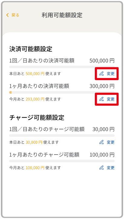 1回/1日あたり、1か月あたりの決済可能額を変更できます。設定金額以下でのお支払いはできませんので、お支払い前に設定金額をご確認ください。
